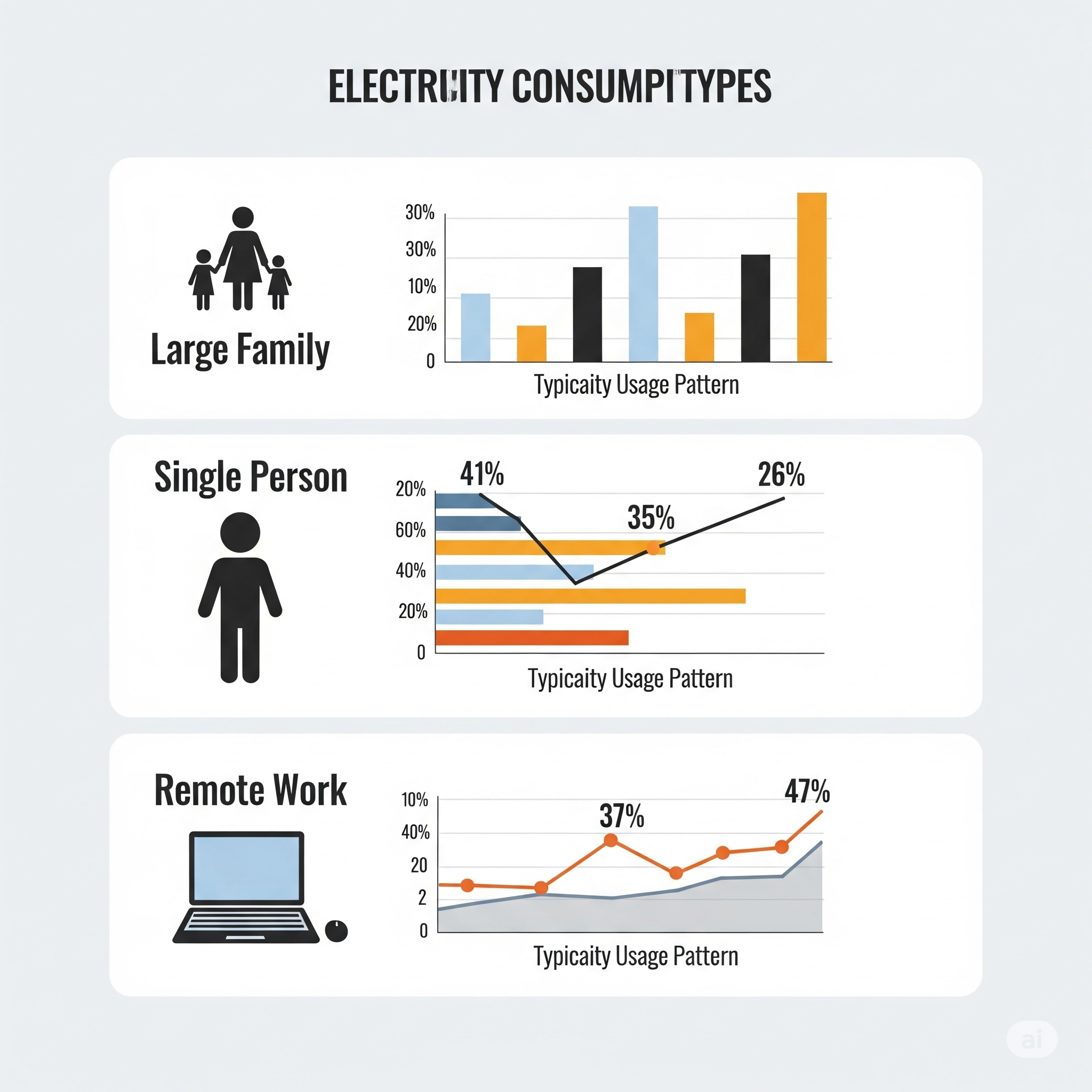 한국에너지공단의 자료에 따르면, 가구 유형별 평균 전기 사용량은 대가족형이 1인 가구형보다 약 2.5배 높고, 재택근무 가구는 일반 가구 대비 낮 시간대 전력 소비가 평균 15% 증가한다고 합니다.